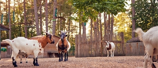 Das Gelände beherbergt einen echten Bauernhof für Kinder: Kaninchen, Ziegen und weitere Tiere können gestreichelt werden.
